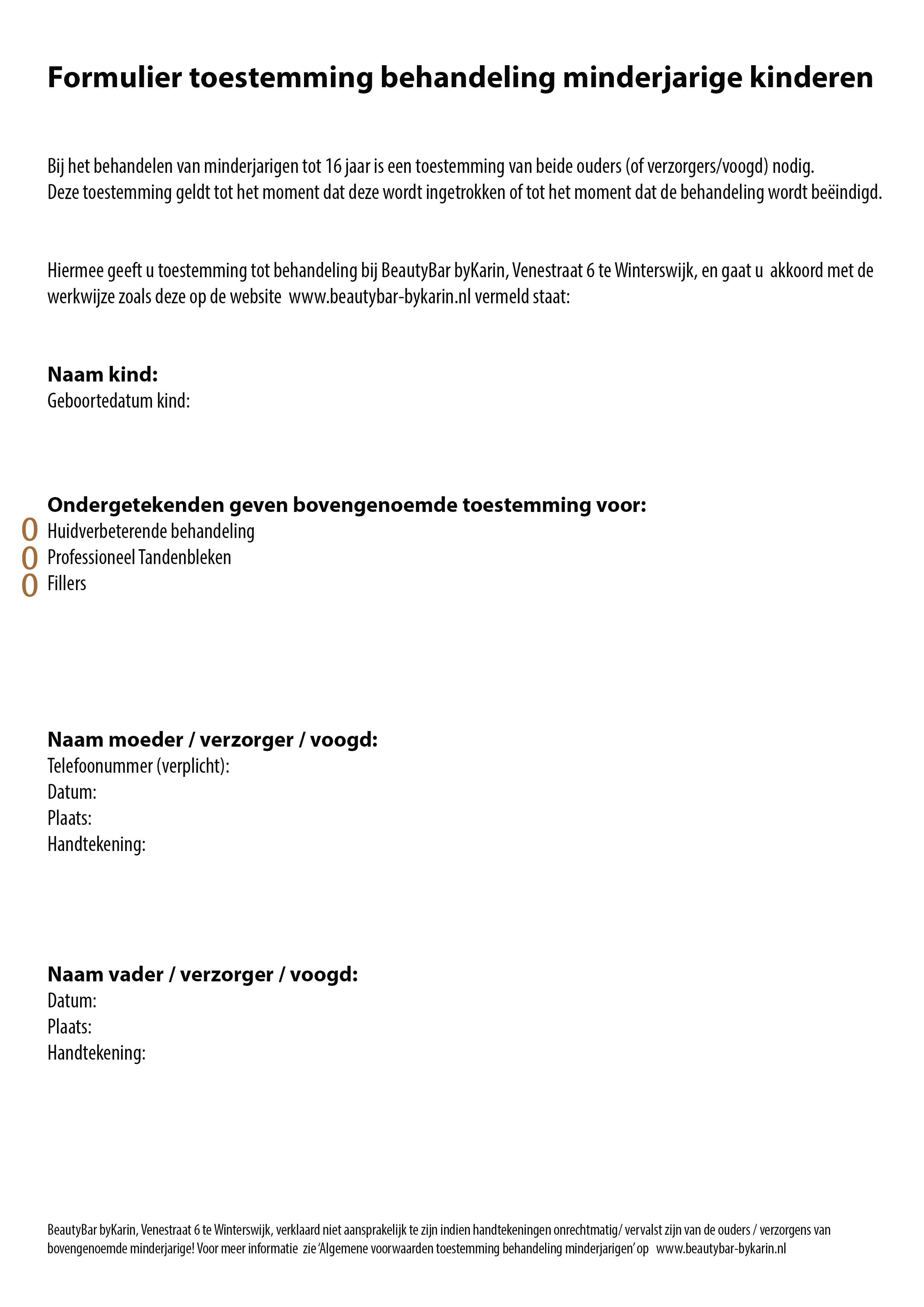 Voor de behandeling van minder jarige kinderen heeft Skin Experts de toestemming nodig van de ouders of wettelijke vertegenwoordigers.